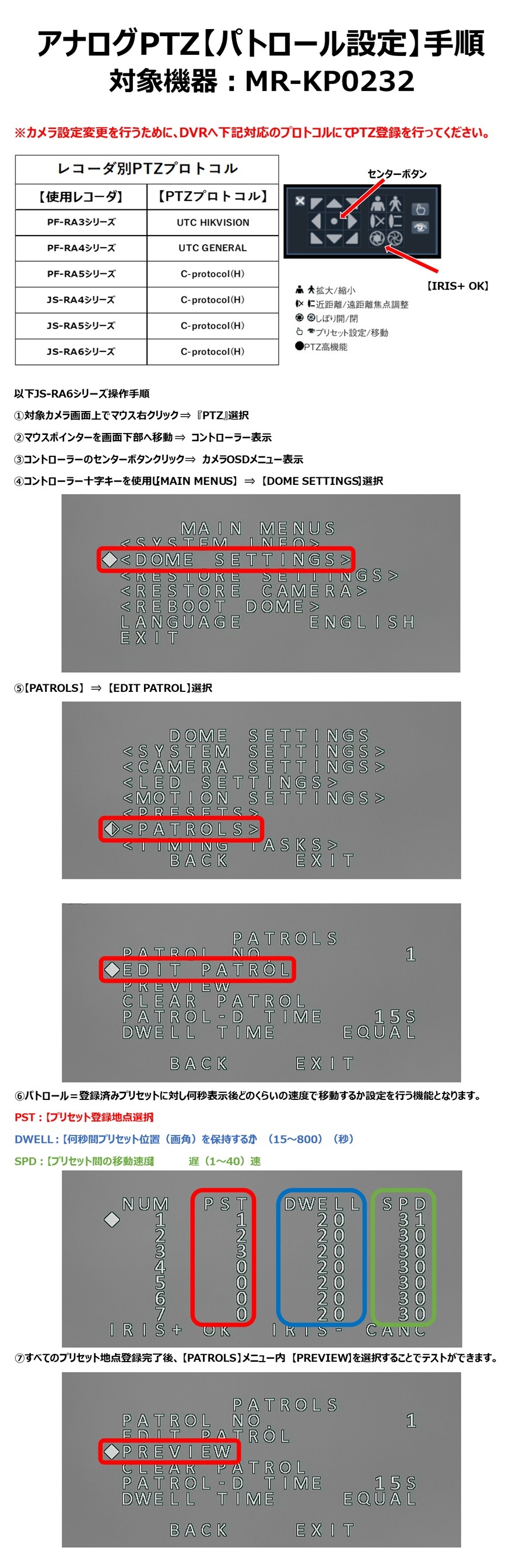 ⑥パトロール=登録済みプリセットに対し何秒表示後どのくらいの速度で移動するか設定を行う機能となります。