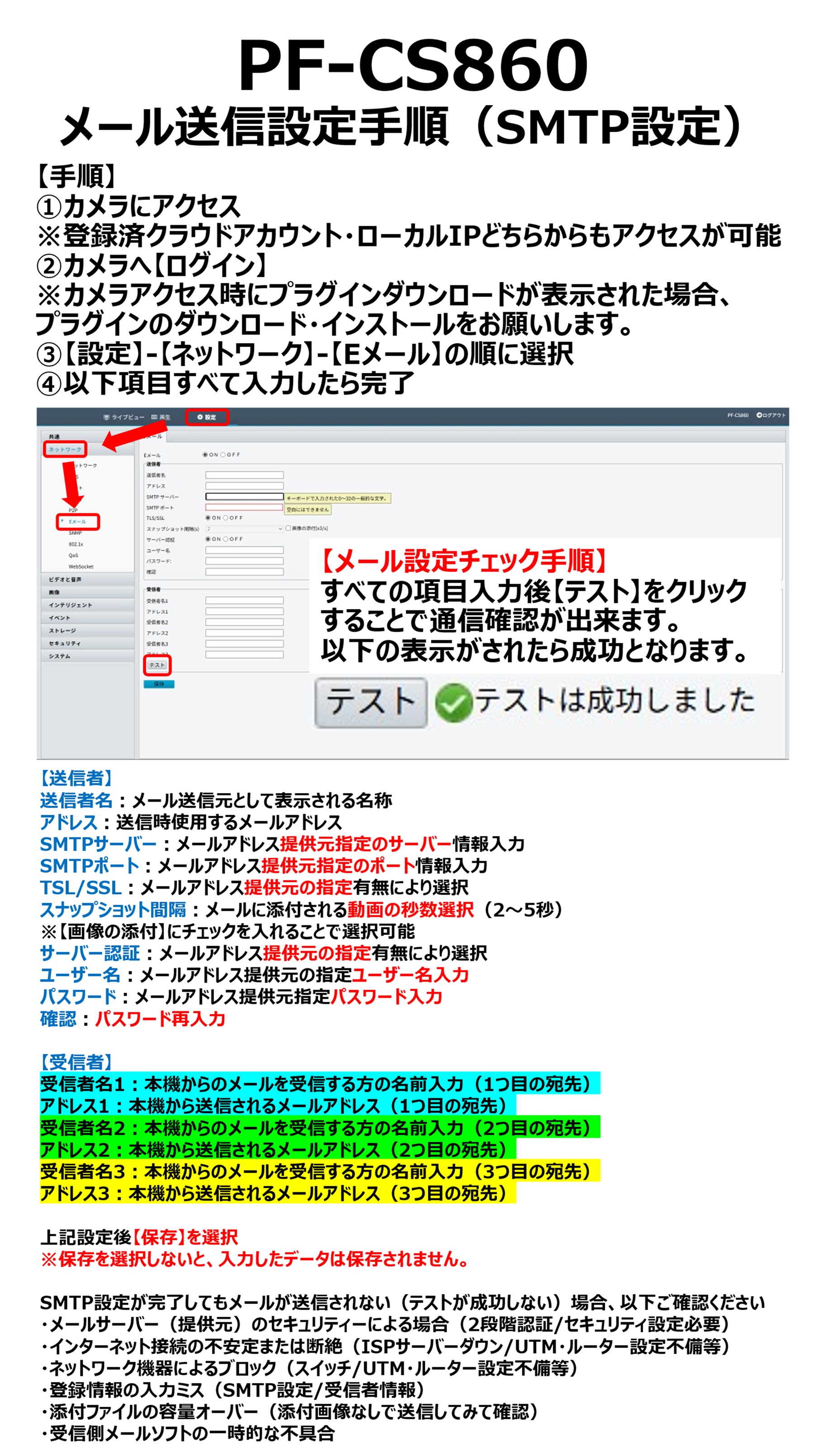 SMTP設定が完了してもメールが送信されない・テストで成功にならない場合、以下をご確認ください
