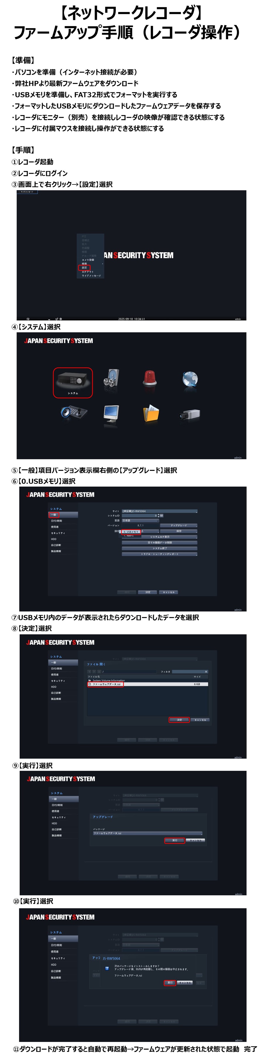 ・USBメモリを準備し、FAT32形式でフォーマットを実行する ※フォーマット手順はこちら