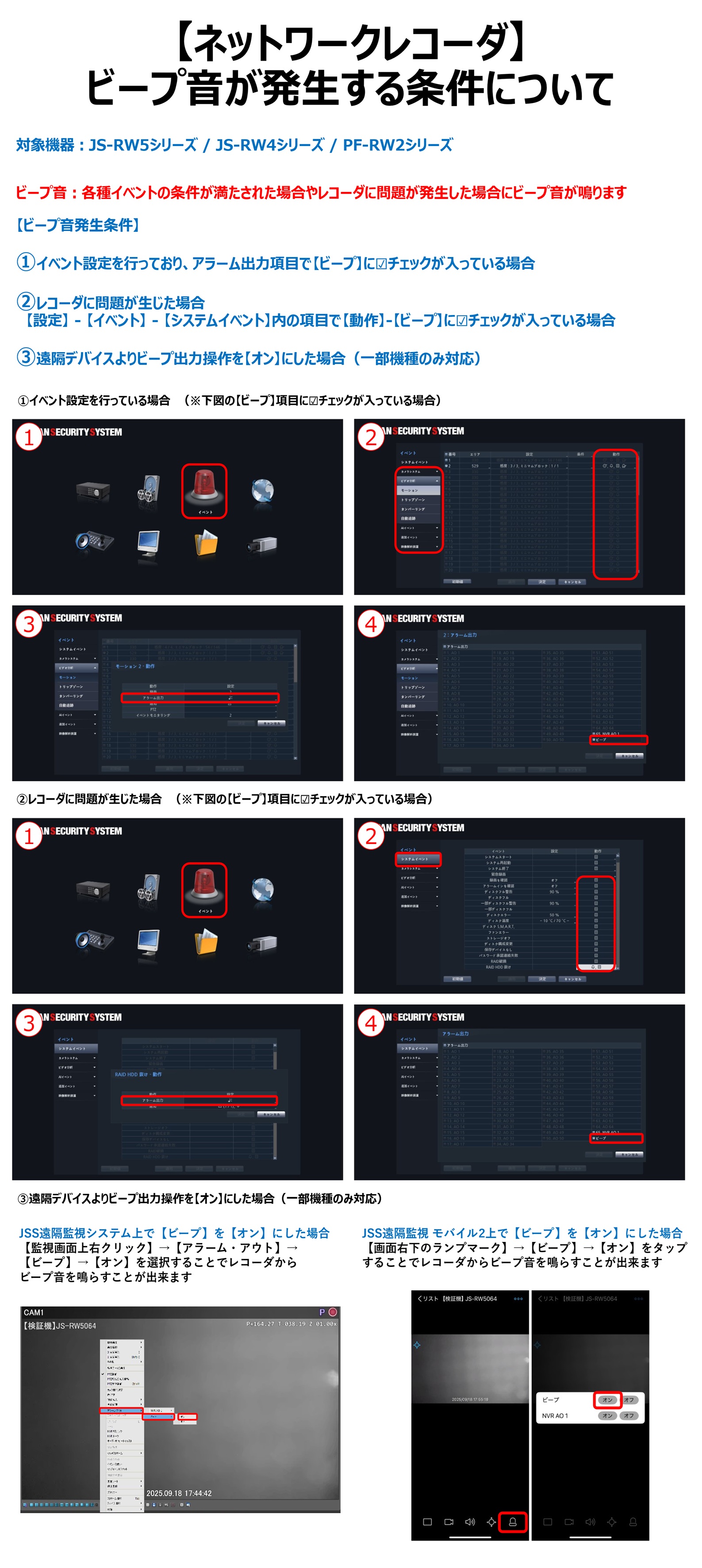 ①イベント設定を行っており、アラーム出力項目で【ビープ】に☑チェックが入っている場合