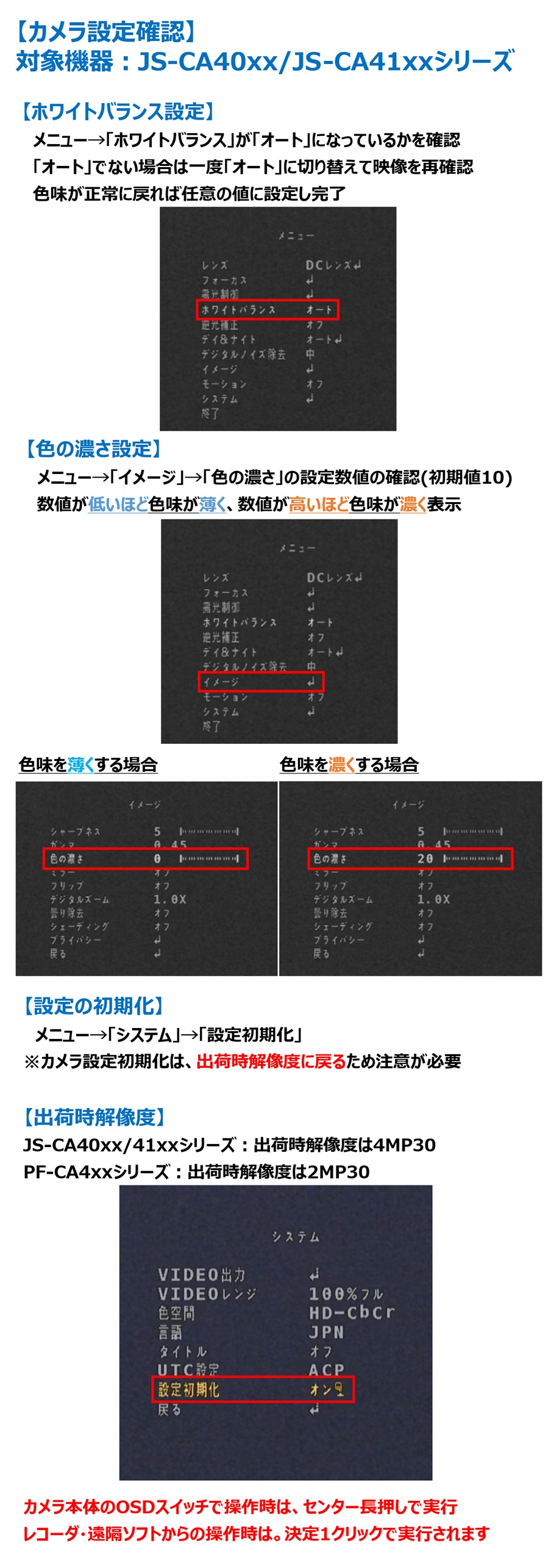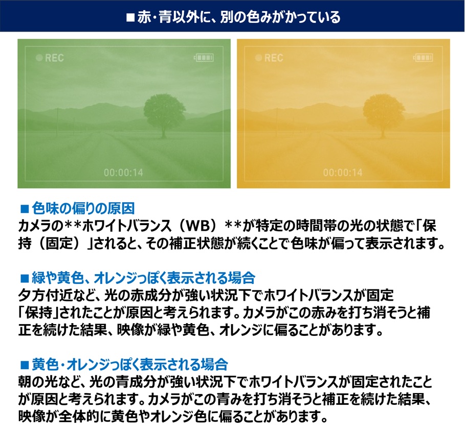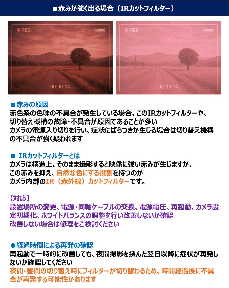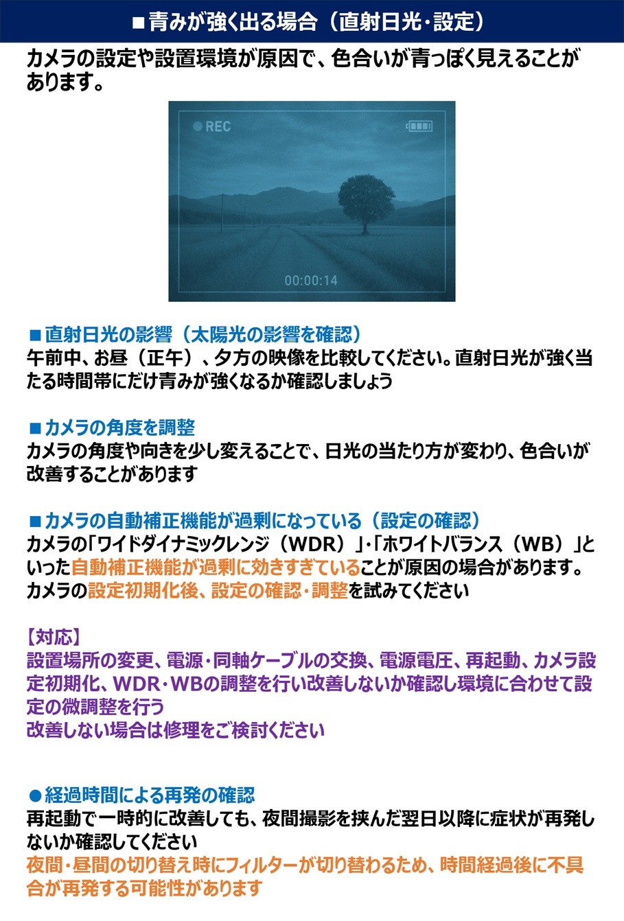 設置場所(画角)の変更、電源・同軸ケーブルの交換、電源電圧、再起動、ホワイトバランスの調整
